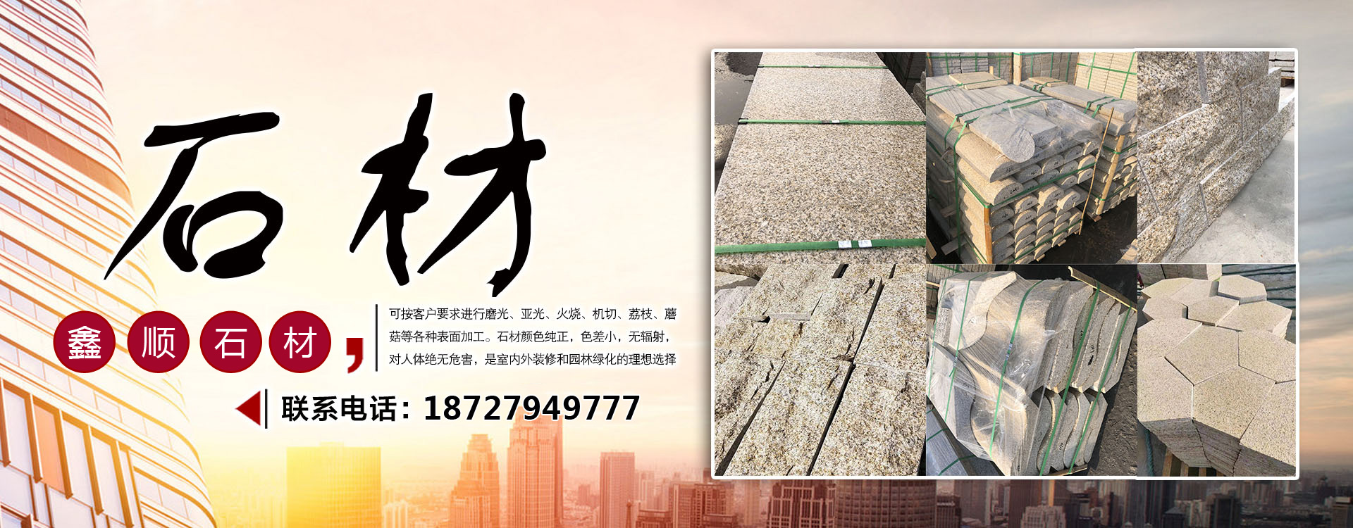 隨州市鑫順石材有限公司位于湖北省隨州市隨縣萬和鎮桐柏山。是一家集礦山開采、石材加工、異形制作、產品銷售為一體的大型綜合型石材企業!本公司主要經營:中花白麻,小花白麻,黃金麻,黃金鉆,芝麻灰,鐘山青,芝麻黑,泌陽紅,各類異形石材。生產的石材規格齊全、做工精細,被廣泛用于外墻干掛、廣場地鋪、市政園林、建筑工程、環境景觀異形石材等各類建筑墻體、地面的裝飾裝修。公司專注于石材行業多年,生產優質的無色差優質白麻,永不吐銹量大,穩定,主攻高鐵站,地鐵站,機場等大型市政房產。可承接各種異形加工,速度快,質量無憂。我們秉承“誠信經營,服務為本”的經營理念,竭誠為廣大客戶提供優質的產品和滿意服務,期待與您的合作,竭誠歡迎國內外新老客戶前來訂購洽談!